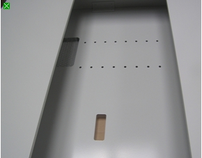 Ausschnitt Kastenkonstruktion mit Aussparung für Motormontage (links oben), Bohrungen und Durchbrüchen, jeweils mit Einlagen unterlegt